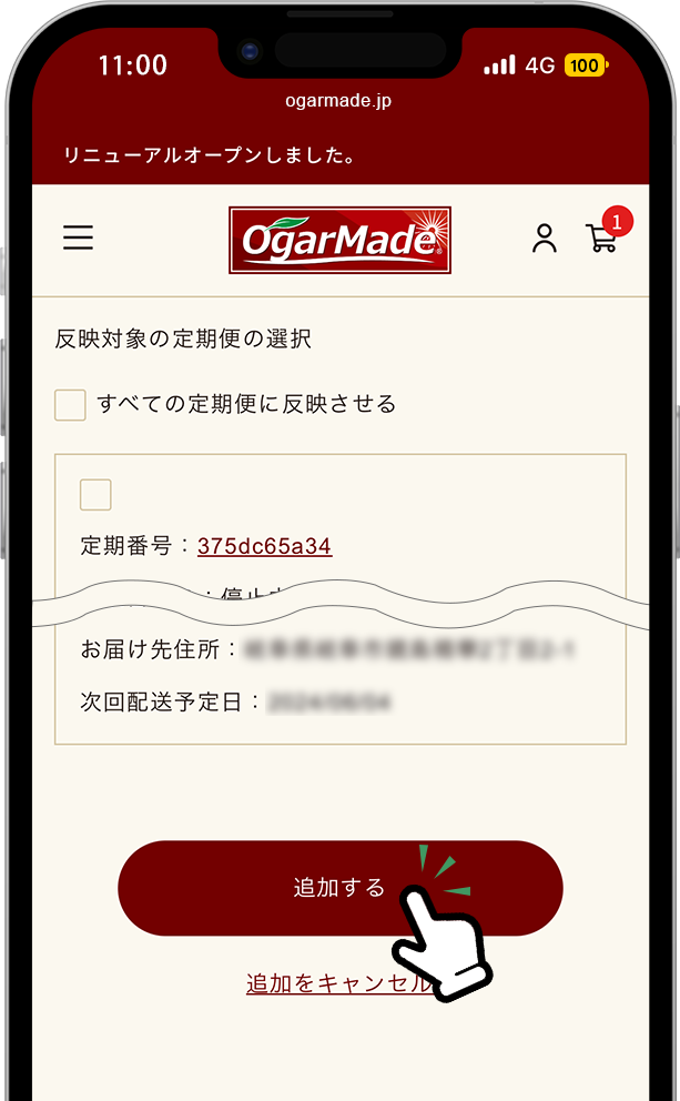 住所入力後、変更したい定期便を選択いただき、追加するをタップしてください。
