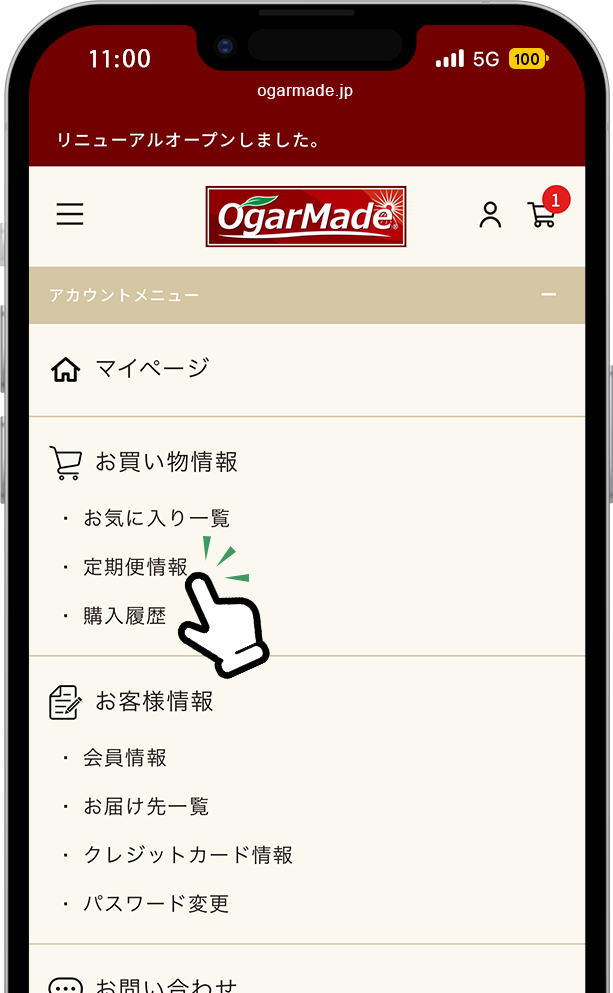 マイページにログインして、「定期便情報」をタップします。