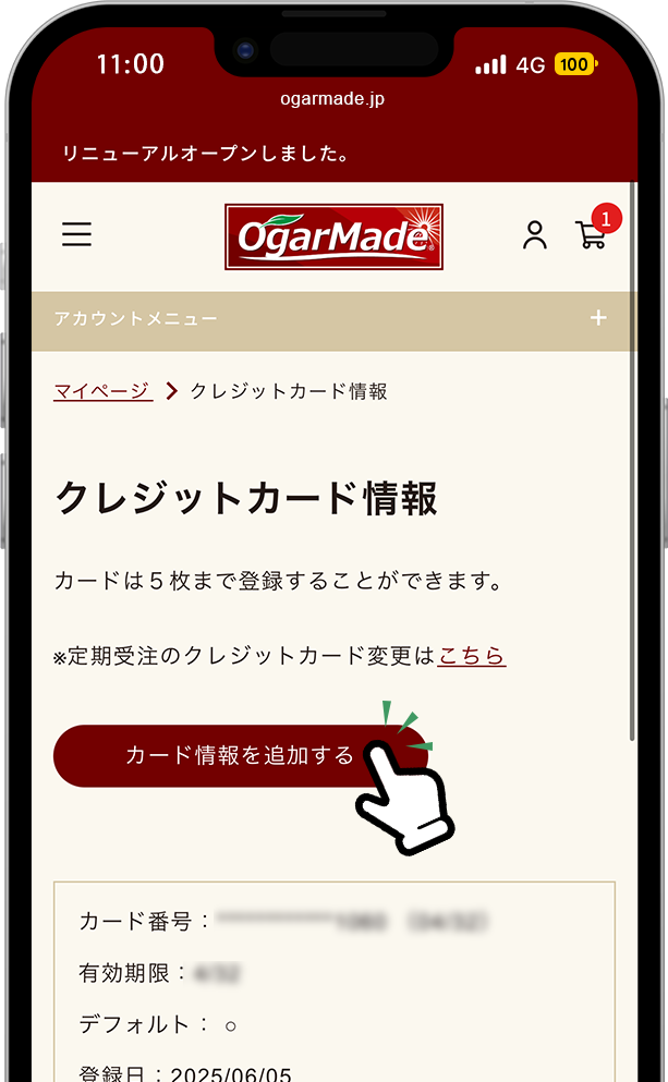 ※クレジットカードは最大5枚まで登録可能です。デフォルトに設定していただくと、新規ご注文時に自動的に選択されます。