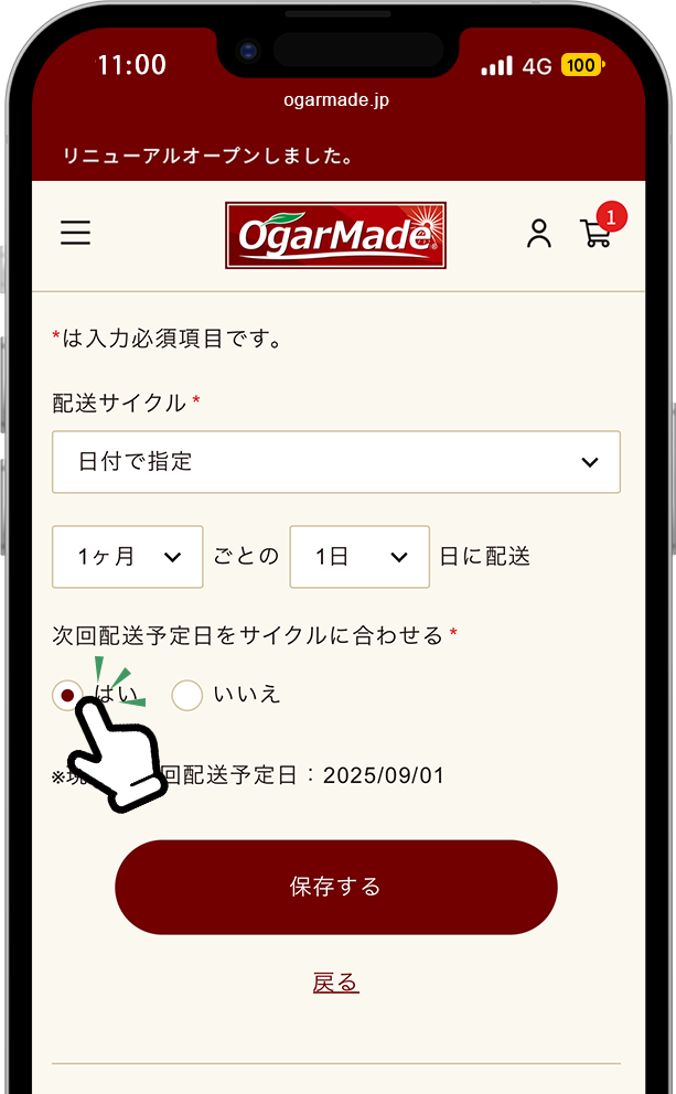 次回配送も変更する場合は「次回配送予定日をサイクルに合わせる」で「はい」を選択ください。