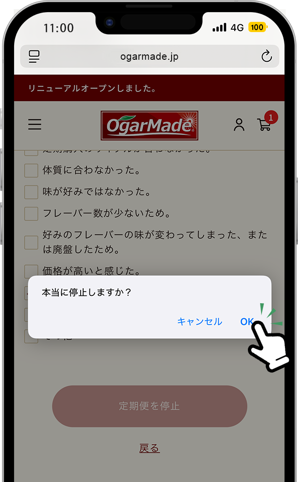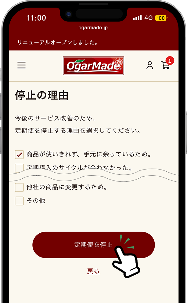 停止理由を1つ以上選択いただき「定期便を停止」ボタンをタップします。